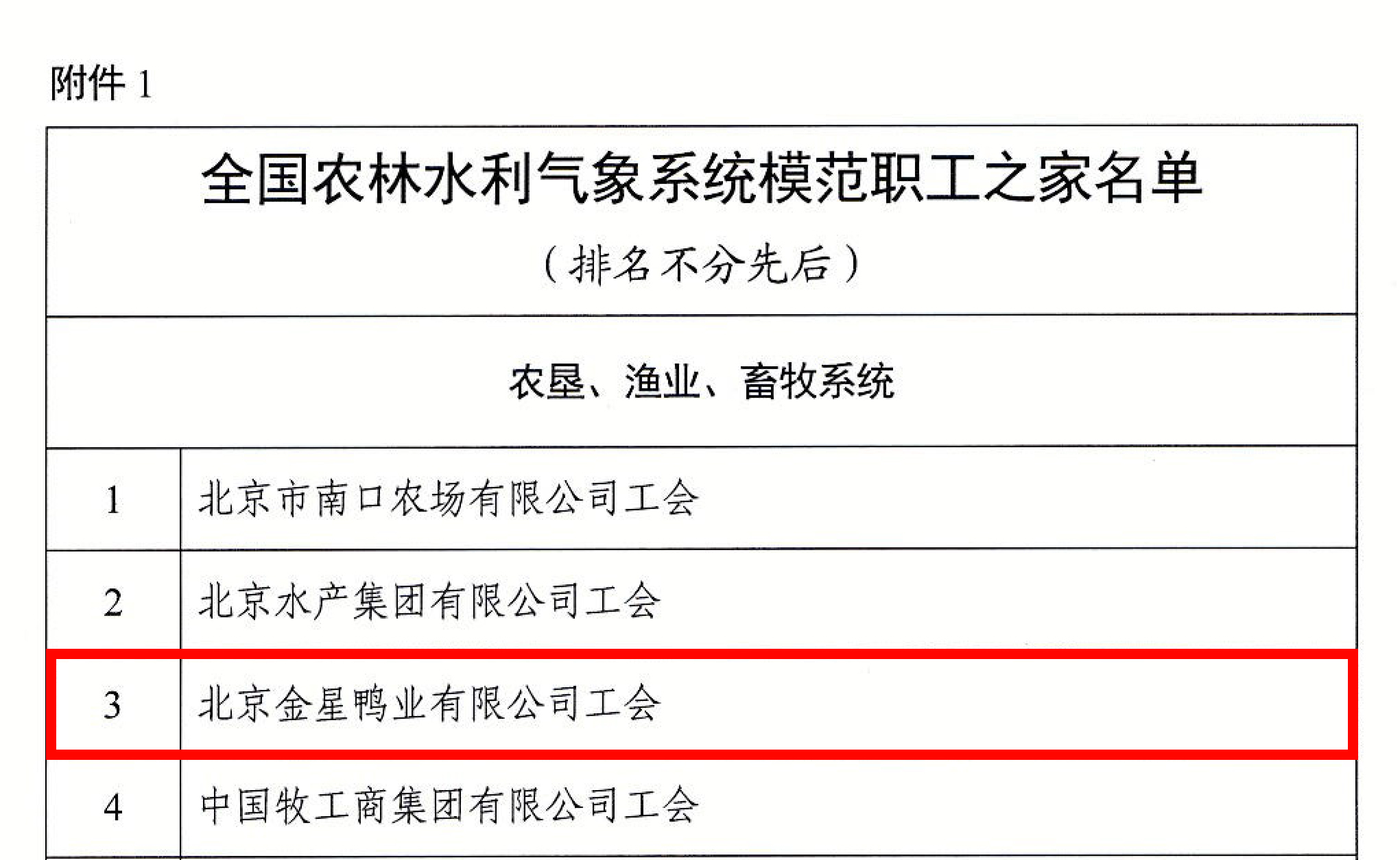近期,全國農林水利氣象系統(tǒng)為樹立典型、宣傳先進, 激發(fā)基層工會組織建設職工之家的積極性和創(chuàng)造性,中國農林水利氣象工會決定確認“北京金星鴨業(yè)有限公司工會”等100 家單位為全國農林水利氣象系統(tǒng)模范職工之家。北京金星鴨業(yè)有限公司工會獲得全國“模范職工之家”榮譽稱號。