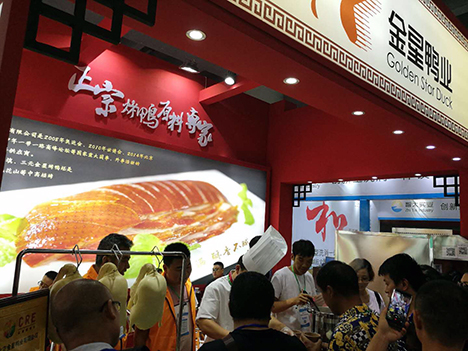 本次展會公司不僅帶去了自主培育的烤炙型北京鴨制作的鴨坯進(jìn)行展示,還安排專業(yè)烤鴨師現(xiàn)場烤炙,讓參會嘉賓近距離觀看正宗北京烤鴨的制作流程,品嘗到北京烤鴨的“本味”。這期間,廣州老字號餐飲店陶陶居的總廚師長也對金星烤鴨連連稱贊。