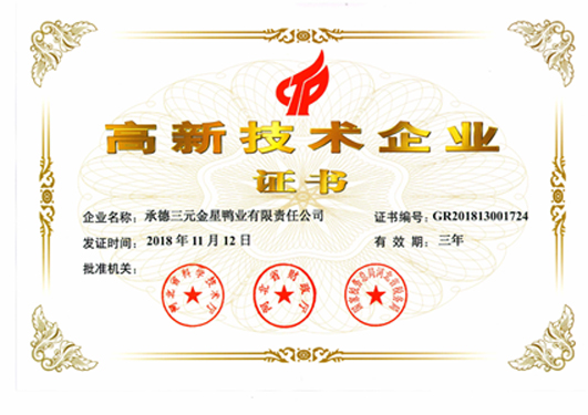 3月25日,經(jīng)過近一年的申報審核,承德鴨業(yè)順利通過了國家級高新技術企業(yè)資質認證,正式獲得了“高新技術企業(yè)”證書。