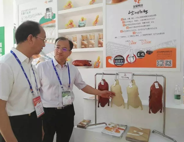 首農(nóng)集團(tuán)董事、首農(nóng)股份董事長尹彥勛在金星鴨業(yè)總經(jīng)理王凱的陪同下蒞臨北京鴨展位參觀并指導(dǎo)工作。