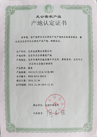 此項認(rèn)證的通過,既是農(nóng)產(chǎn)品質(zhì)量監(jiān)督部門對我公司北京鴨產(chǎn)品質(zhì)量的認(rèn)可,也極大的提升了公司產(chǎn)品品牌形象。